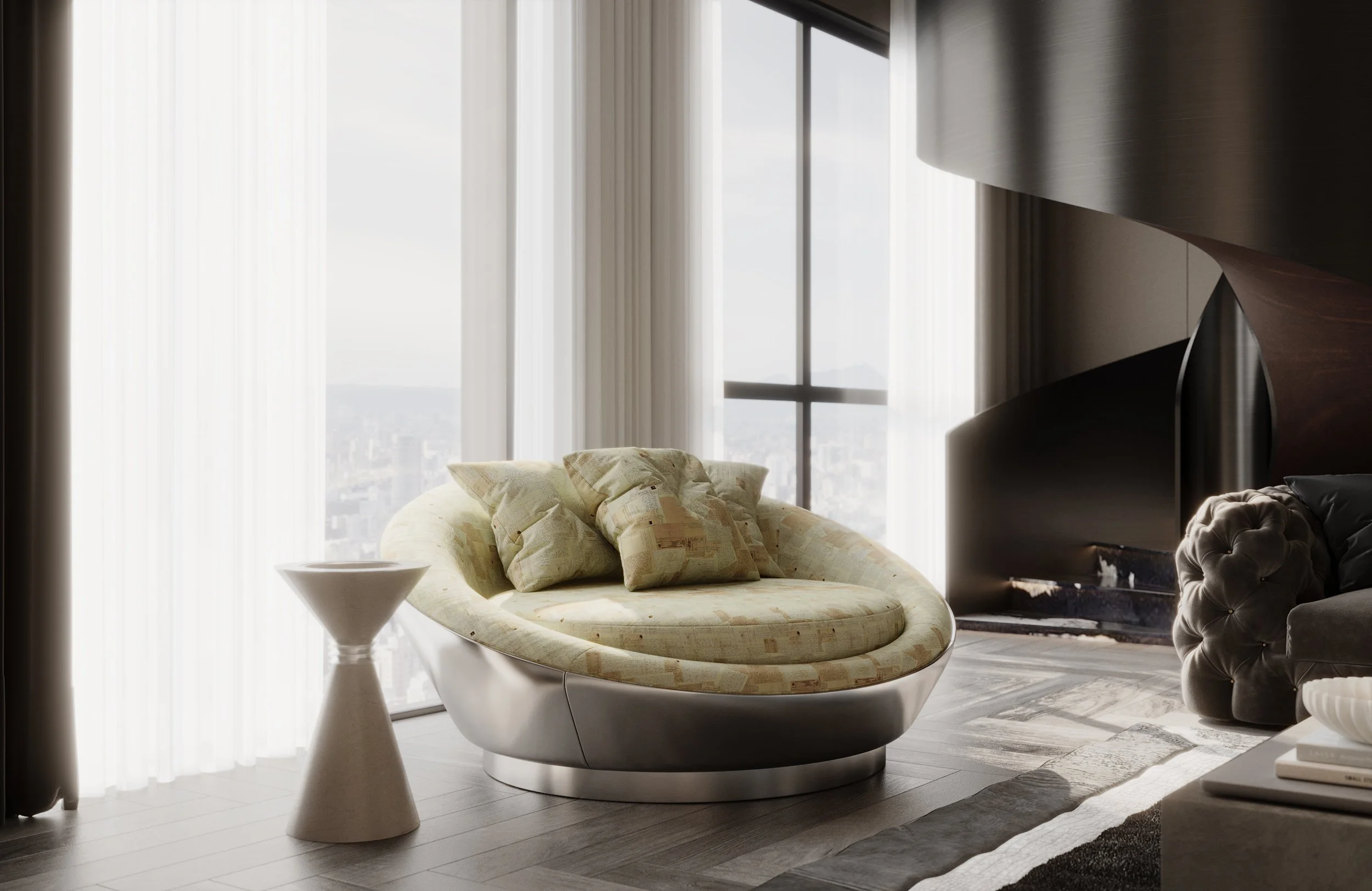 The form remains lunar, soft, and enveloping. The curves embrace, the seat invites, the silhouette recalls the stillness of the moon — but here, the moon holds secrets. It listens. It remembers. And it never lets go.